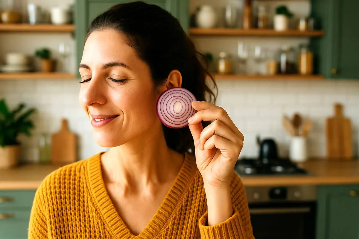 برخی روشهای سنتی توصیه میکنند چند قطره از آب پیاز تازه را (پس از صاف کردن و اطمینان از عدم وجود ذرات) روی پنبه ریخته و در دهانه گوش گذاشته شود، نه در عمق گوش. این روش ممکن است درد را کاهش دهد، اما ورود مستقیم مایع پیاز به مجرای گوش خطرناک است و در صورت پارگی پرده گوش یا عفونت شدید، میتواند باعث تحریک بیشتر یا سوختگی شیمیایی شود.