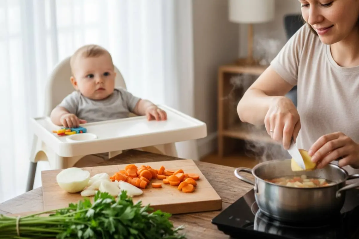 کمی برنج و سبزیجات نرم مثل هویج یا کدو را با مقدار کمی مرغ پخته یا آب گوشت رقیق در قابلمه بریزید. با حرارت ملایم بپزید تا مواد کاملاً نرم شوند، سپس آن را له یا صاف کنید تا بافتی نرم و مناسب نوزاد پیدا کند.